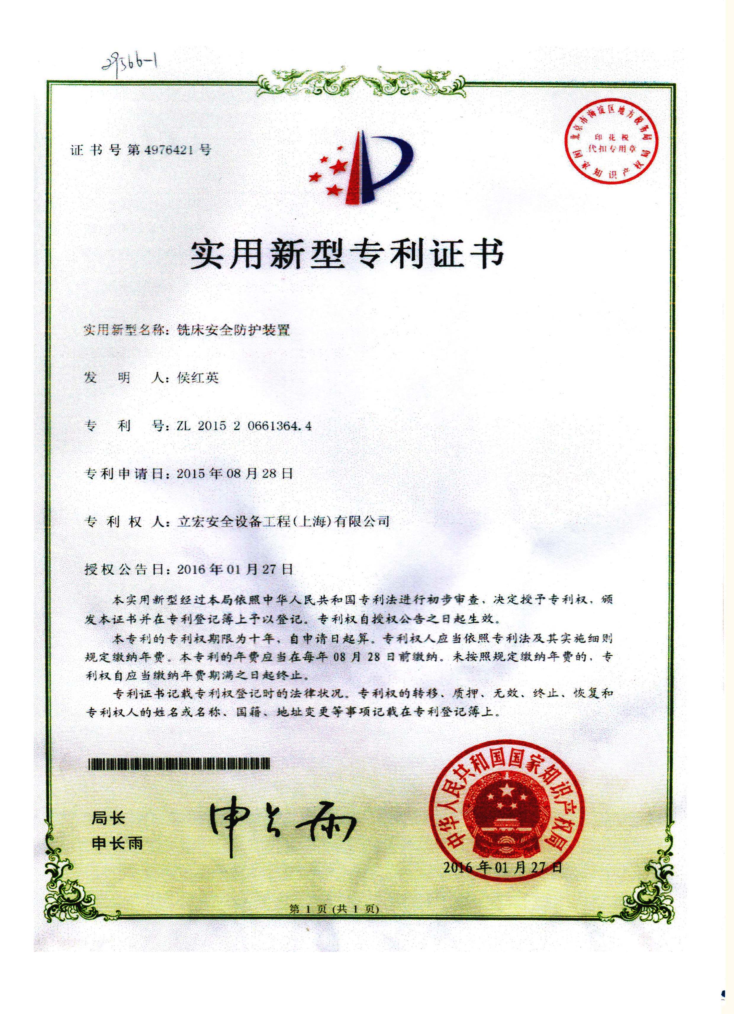 實用新型名稱:銑床安全防護裝置專利號:ZL2015 20661364.4
