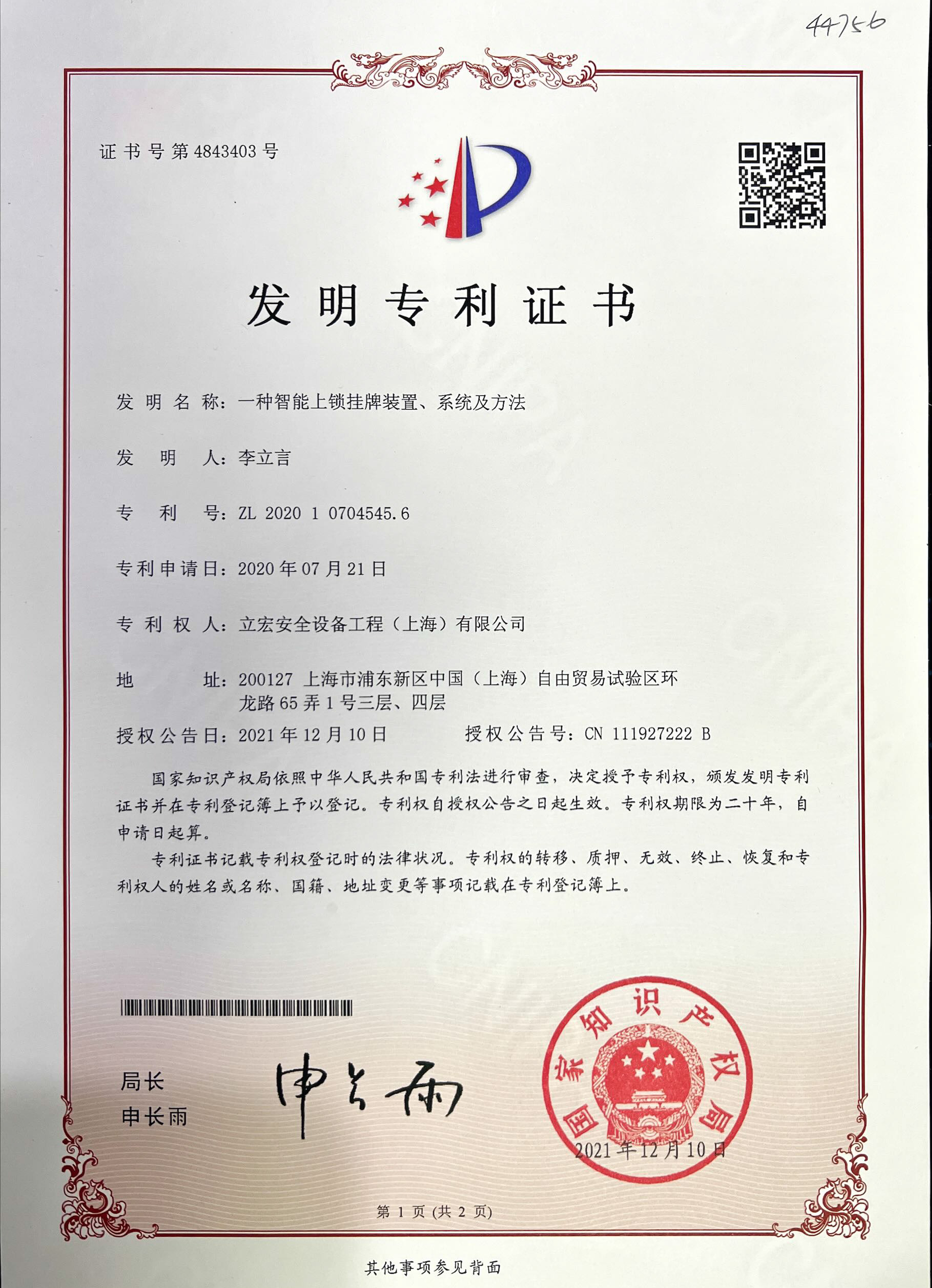 一種智能上鎖掛牌裝置、系統(tǒng)及方法專利號:ZL202010704545.6