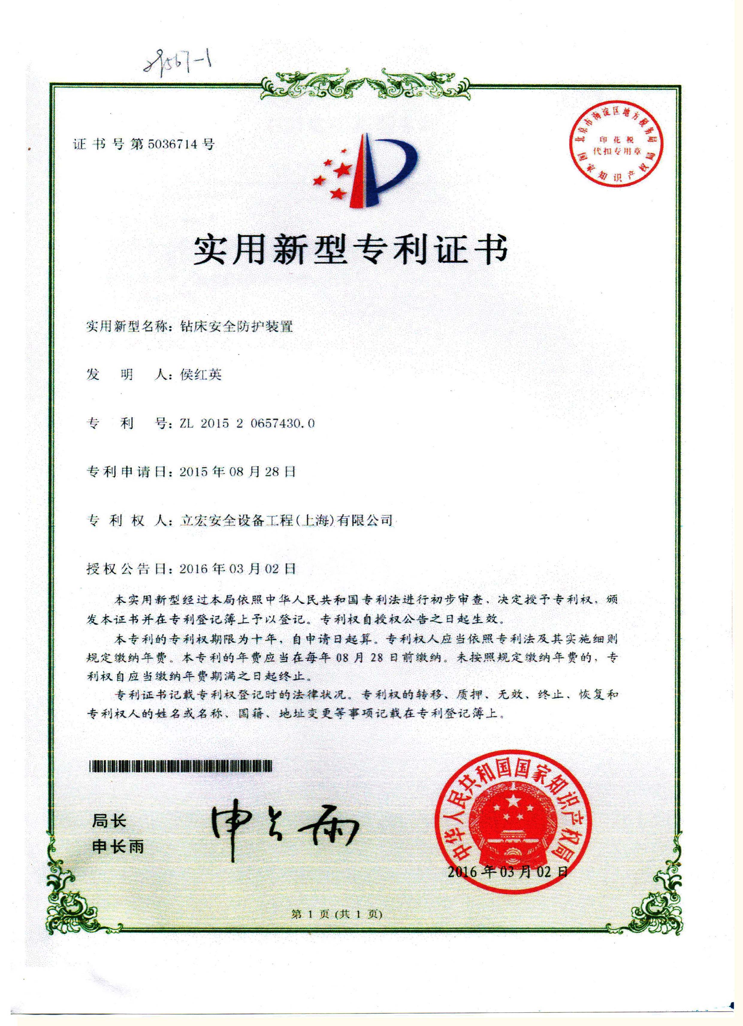 實用新型名稱:鉆床安全防護裝置專利號:ZL 2015 2 0657430.0