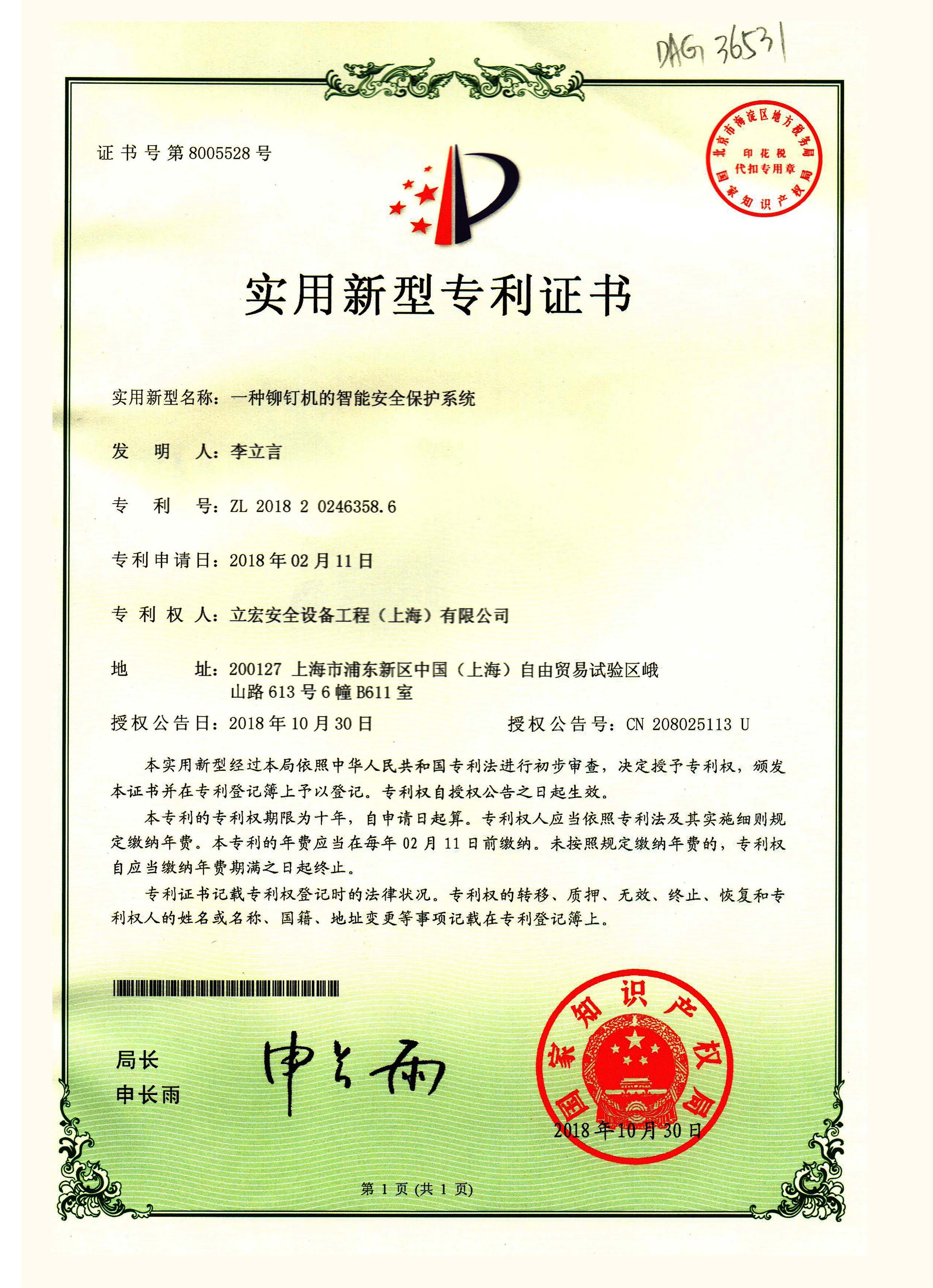 實用新型名稱:一種鉚釘機的智能安全保護系統(tǒng)專利號:ZL201820246358.6